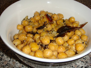 Heat oil in a pan. Season it with mustard, curry leaves and chillies. When the mustard starts to pop add the chickpeas that are drained well. Add the sugar or jaggery and coconut gratings. Mix well. Add salt. Allow to simmer for 6-7 mins.