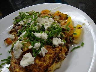 Method: Heat skillet. Spray PAM and add the egg mixture so that it spreads to the entire pan. Season with salt and pepper. Spread onions, bell peppers and mushrooms so that they cover the entire omelette. Press the vegetables lightly with a spatula. When the omelette turns golden brown flip half of the omelette so that it covers the other half. Reduce heat and cook further till the eggs are completely cooked. Place the omelette on a serving plate. Spread with chives and goat cheese. We like to have ours with a cup oh hot dark chocolate or apple juice on the side.