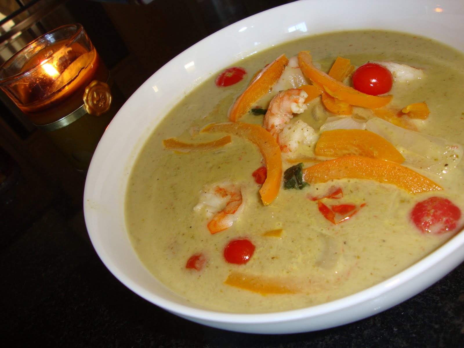 Bring half a can of light coconut milk to boil. Add 1 tbsp of green curry paste. Mix well. Simmer for 5 more mins. Add 1/2 tsp palm sugar and salt. Add the remaining milk. Now add about 15 jumbo shrimp + 15 cherry tomatoes + 1/2 cup diced bell peppers + 1/2 cup yellow onions. Cover and simmer on medium heat for 6-7 mins. Add some lime juice. Complete the dish with a garnish of generous amount of basil leaves.