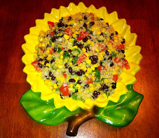 1 Put the rinsed quinoa, salt and water into a pot and bring it to a boil. Cover and simmer gently until the quinoa absorbs all the water, about 10-15 minutes. Remove from heat and let sit for 5 minutes. Place into a large bowl and fluff up with a fork to help it cool more quickly.2 While the quinoa is cooking, prepare the rest of the salad. Soak the red onions in the lime juice and set aside. Soaking the onions in lime juice (or lemon juice or water) helps take the edge off of them. Mix the prepped black beans, corn kernels, tomatoes, cheese, jalapenos, cilantro, and oil into a large bowl.3 When the quinoa has cooled, mix it into the bean mixture. Add the red onion and the lime juice and add salt, more oil or lime juice to taste. Serve at room temperature.Yield: Serves 4-6.Courtesy: Pushpanjali Shenoy(recipe learnt from Simplyrecipes.com)
